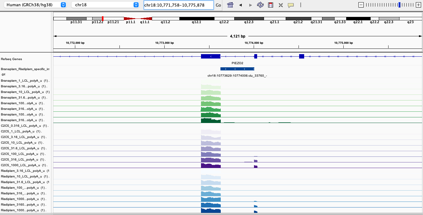 ENSG00000154864.12 6.4592491 5.8319535 6.0927097 -0.9000000 -0.8000000 Branaplam_100_LCL_polyA_1 Risdiplam_316_LCL_polyA_1 -0.6272956 -0.3665394 Risdiplam-specific 15.785807 PIEZO2 chr18:10773629:10774006:clu_33760_-