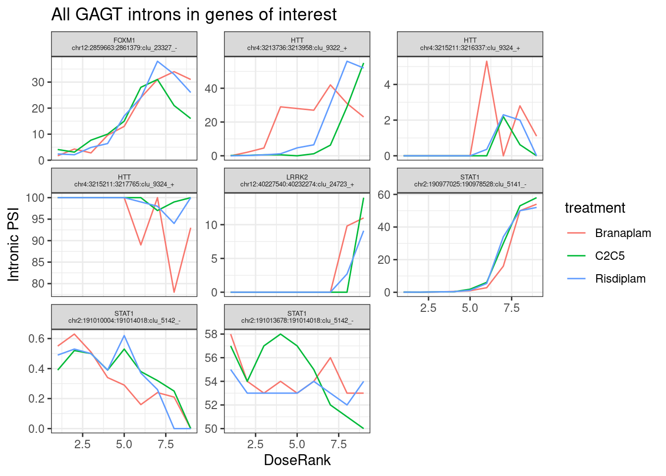 Ok, so I can see the dose response gene expression effects on those genes. And also here are the dose response splicing effects for all the detected GAGT introns (and passed default leafcutter cluster filters) in those genes. The intron in FOXM1 is not in the large table because it didn’t pass my filters for specific splicing effects, and that seems understandable looking at the splicing data. The LRRK2 intron isn’t in the long table because I didn’t even attempt fitting a dose-response curve to the splicing data because I filtered for introns with spearman > 0.9 in at least one treatment. Perhaps that is a bit too strict to capture these introns that only start to show effects at the high doses.